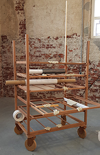 The starting point for DIALOGUE was an empty studio space, equipped with a metal shelf, a table and a chair. Three people took turns in working alone, one after the other, reacting to each other’s contributions. Instead of using spoken words we established a dialogue through materials and objects. By accumulating, modifying, adding, taking away, the situation kept changing and blurring the lines between individual intervention and common dynamics. DIALOGUE is a template for future conversations on different locations and with different participants.